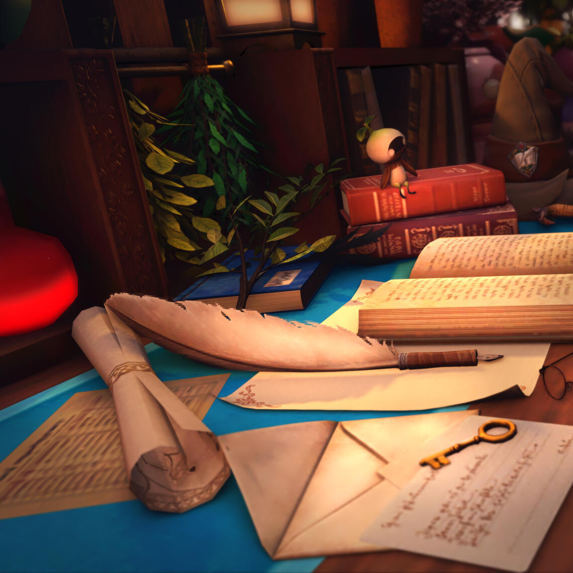 A small and cozy botanist-themed cottage with dim lighting, large window fronts and skylight windows.